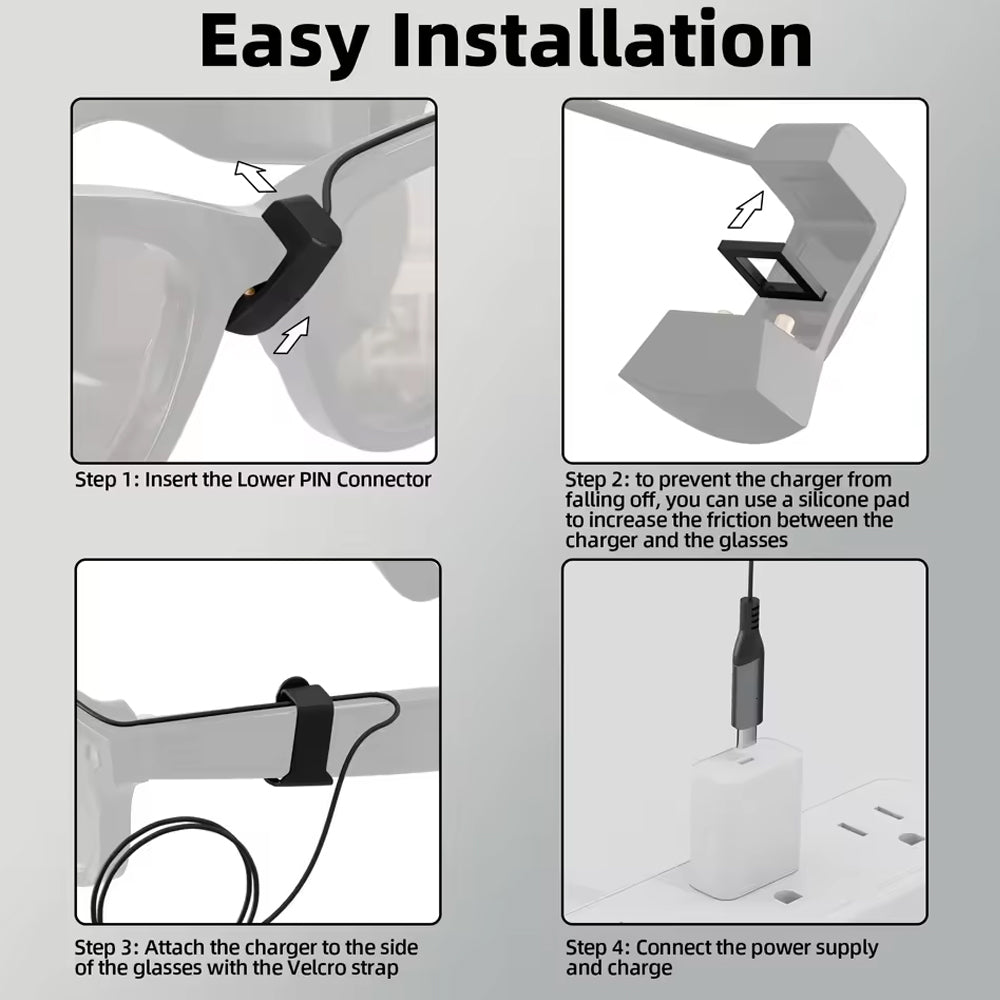 Firm and Solid: A silicone pad will be used to make the charger more firmly attached to the RayBan Meta glasses. In addition, the charger cable can be fix to your smart glasses by velcro on the side, makes it tightly fit on glasses while walking.