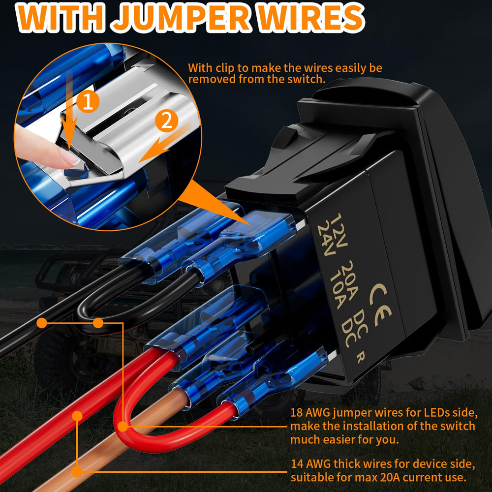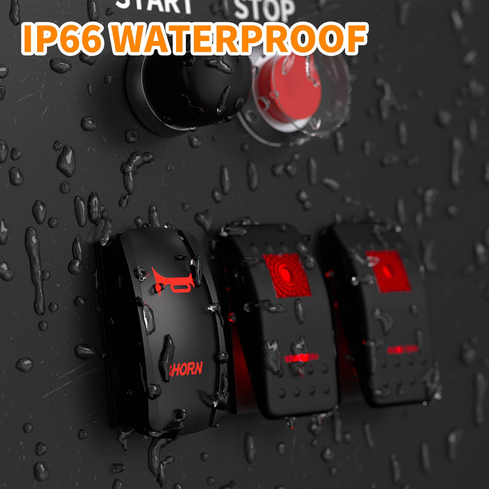 The boat rocker switch rated current is 20 Amps 12/24 Volts. It is mainly used to control LED lamps for utv automobiles, ships and yachts, such as led strips, headlights, taillights, work lights, fog lights, auxiliary lights, etc.