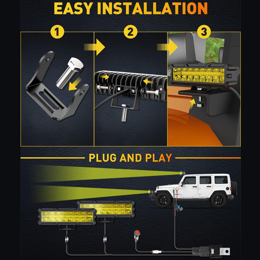 [Versatile Application] - With its sleek and cool black design, the LED light bar fits an array of vehicles and can be utilized for various purposes such as LED tractor lights, off-road lights, fog lights or ditch lights. Also ideal for travel, long-distance transportation, and courtyard light, our LED pod lights are the perfect addition to enhance outdoor adventures.