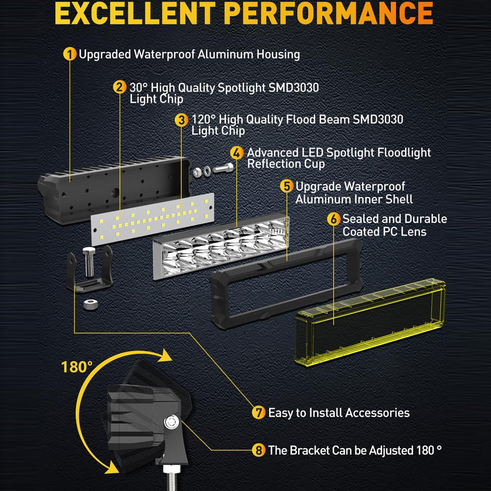 [Spot & Flood Combo Led Light Bars] - NAOEVO LED fog lights features a 30° spotlight reflector to provides high-focus, long-range illumination, while the 120° flood beam can provide wider area exposure. Their combination will have a stronger lighting effort than other single-function lights.