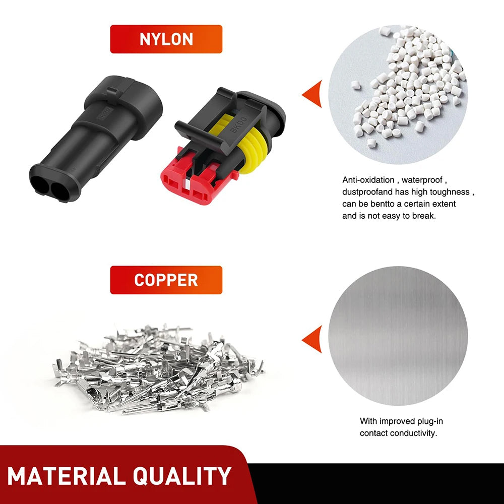 *Connector Terminals: The good-quality rubber seal makes it better dustproof and waterproof, waterproof level: IP67. The female & male terminal is composed of pure copper and phosphor copper, which has high conductivity.