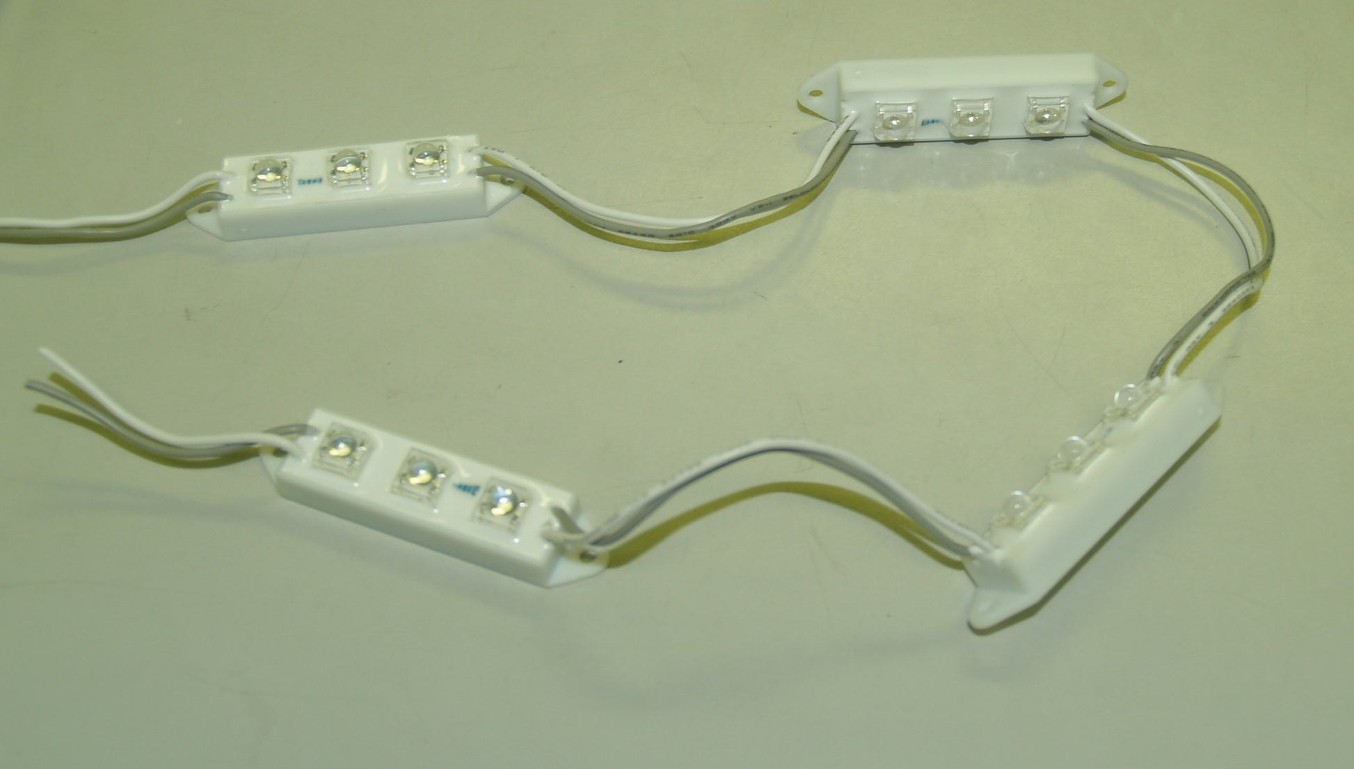 Here we have 10 x Warm White 3 led module blocks with wire coming out each end.