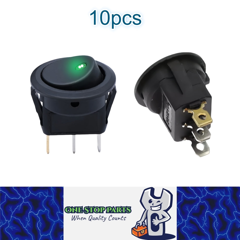 Here we have 10 x Round Rocker Switch Car Boat Dashboard 3 Pin ON-OFF 12V DC 20A Switch Button with Green LED Light.