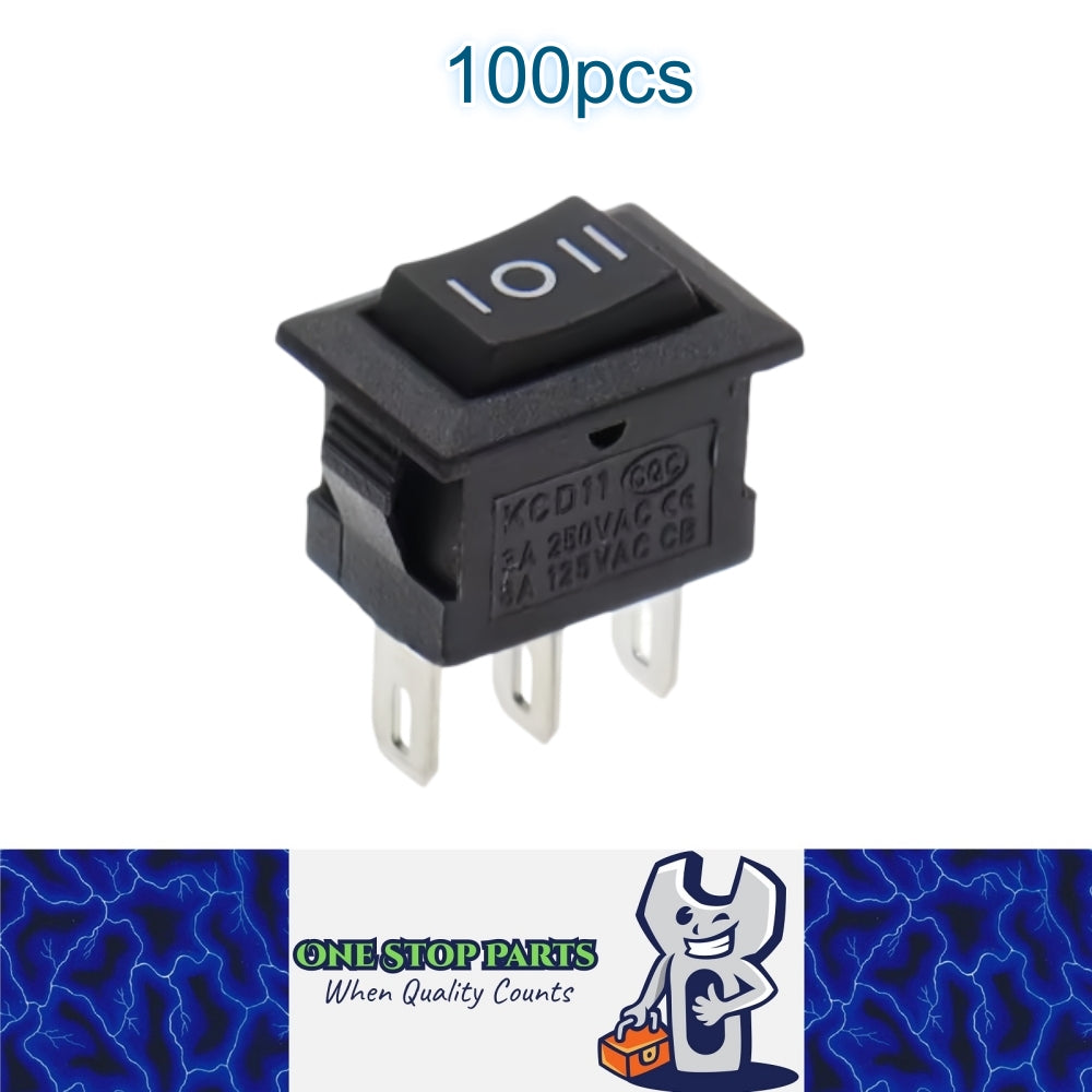 Here we have 100 x Black Rocker Switches 10x15mm ON/OFF/ON 3 Pin SPST Panel Mount Mini Switches.
