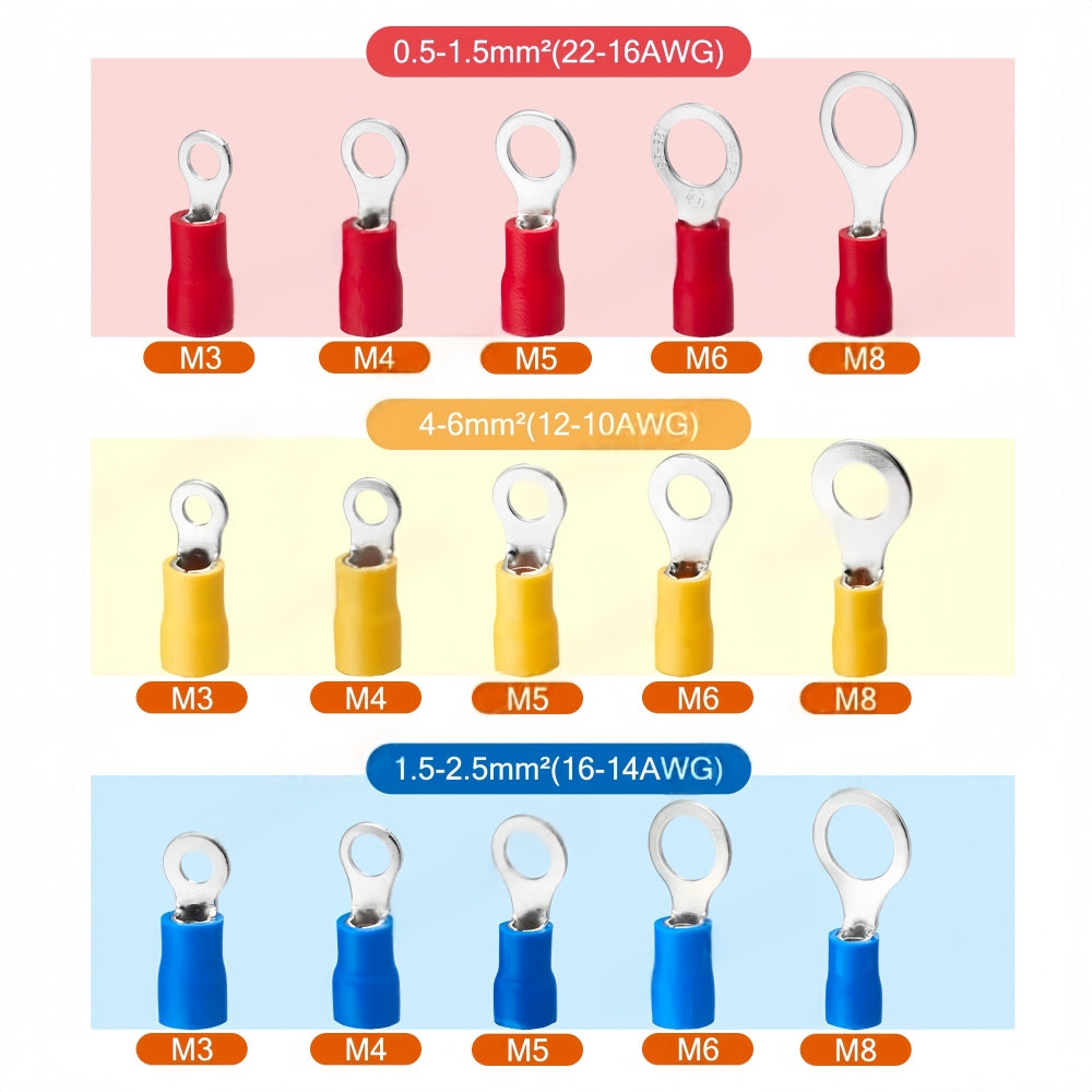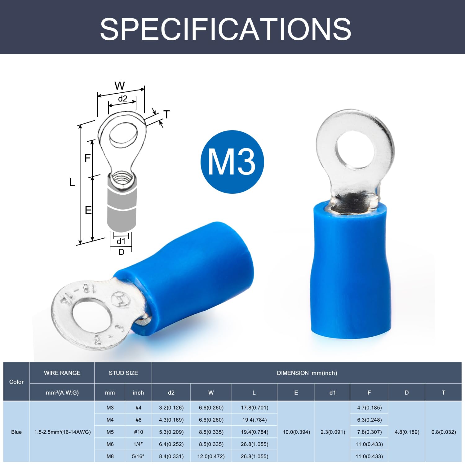 * Specification: 100 pieces, brass copper, colour Blue, ring size diameter M3 #4, for cable 14 15 16 awg gauge 1.5-2.5mm².