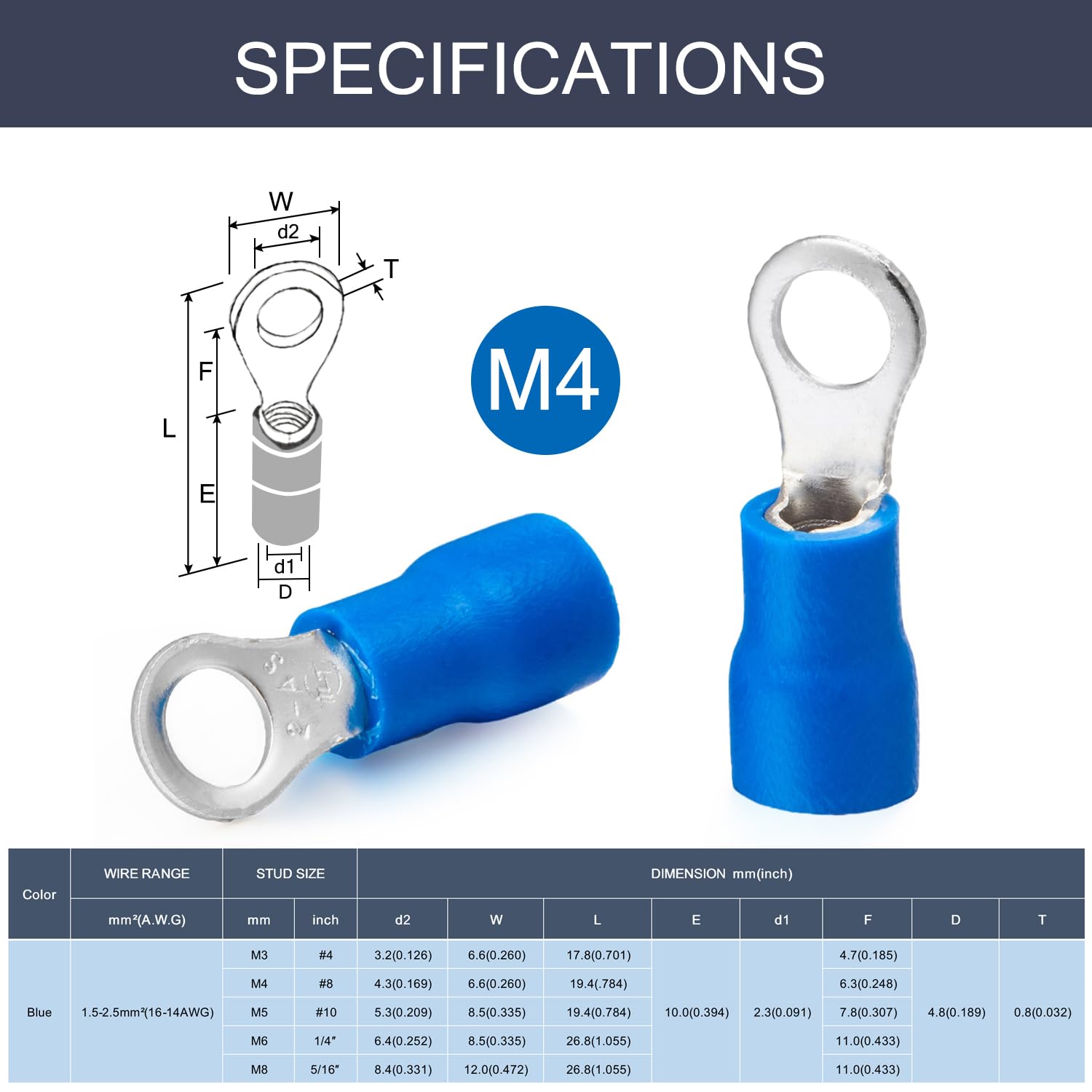 * Specification: 100 pieces, brass copper, colour Blue, ring size diameter M4, for cable 14 15 16 awg gauge 1.5-2.5mm².