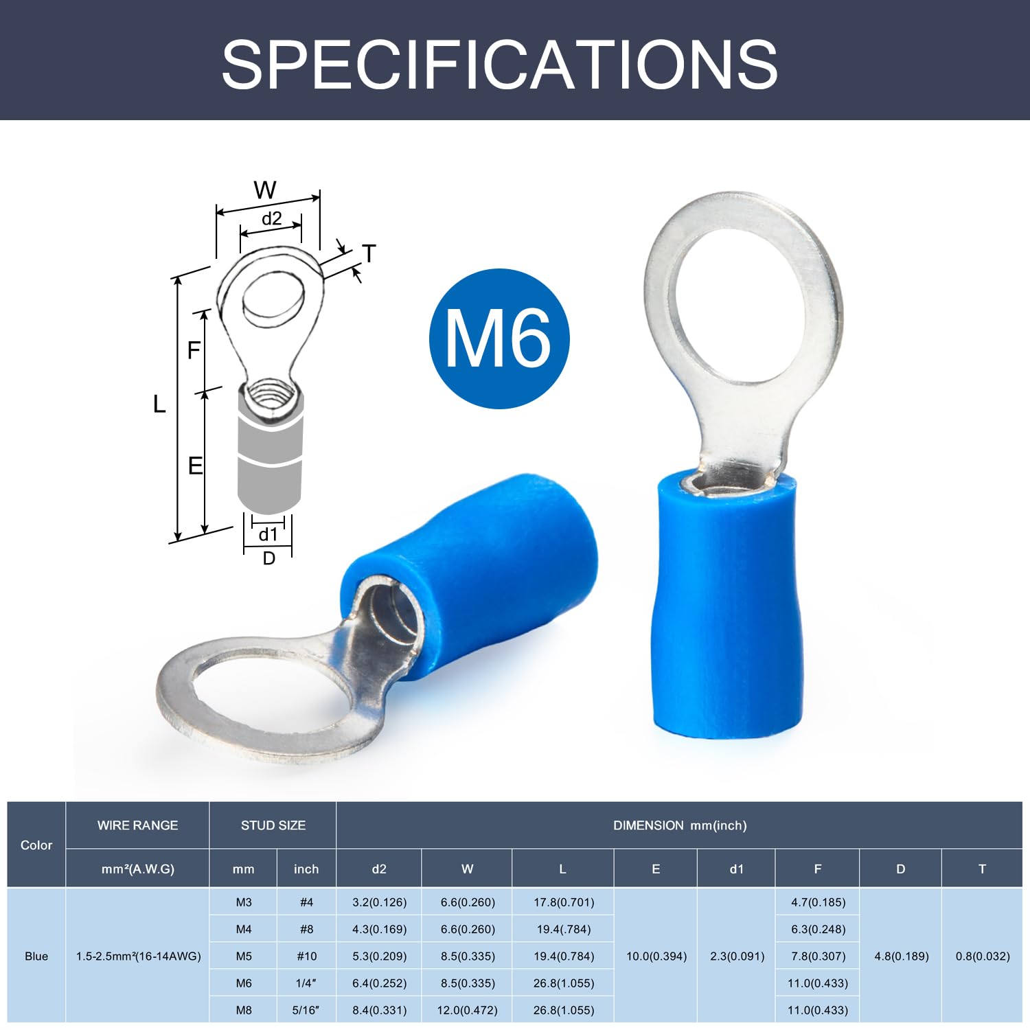 Here we have 100 x Blue Ring Terminals M6 RV2-6 Ring Crimp Terminals 16-14AWG Wire Connectors.