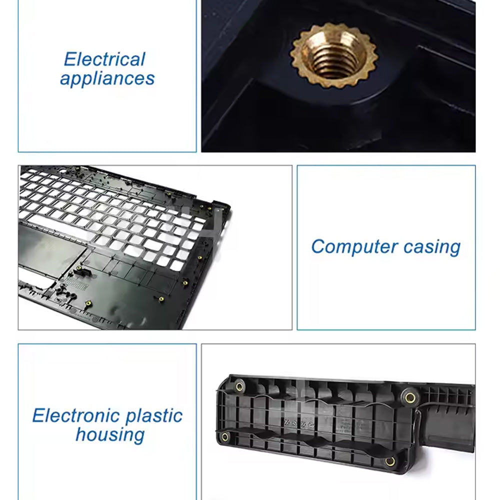 【Wide Application】 - These inserts are designed for use with all thermoplastics, including materials like PLA, PETG, ABS, PPS, PP, and others. Whether installing them in 3D printed objects, injection-molded plastic parts, automotive plastic casings, or laptop shells, these inserts offer reliable and durable solutions.