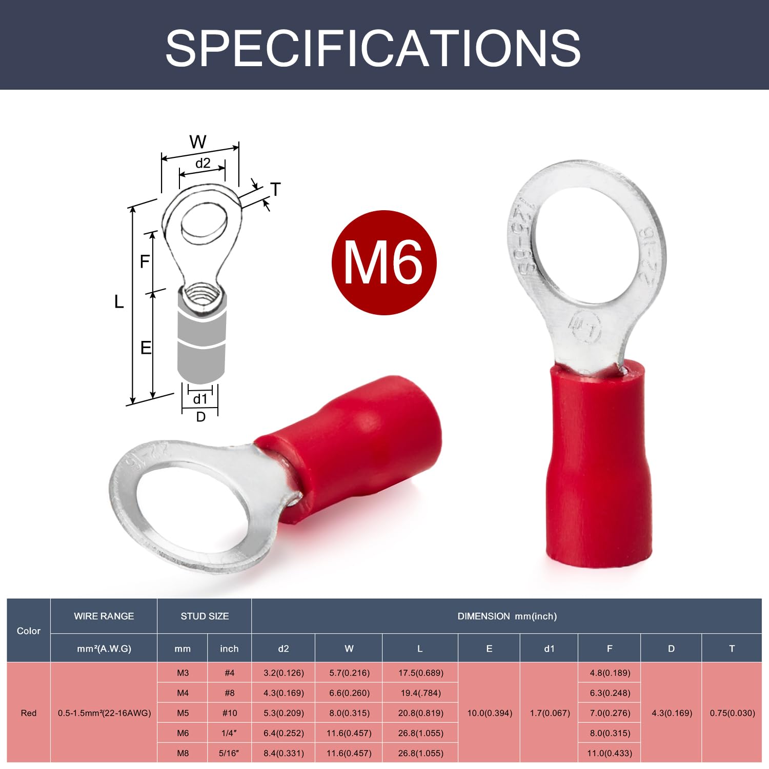 Here we have 100 x Red Ring Terminals M6 RV1.25-6 Ring Crimp Terminal 22-16AWG Wire Connector.