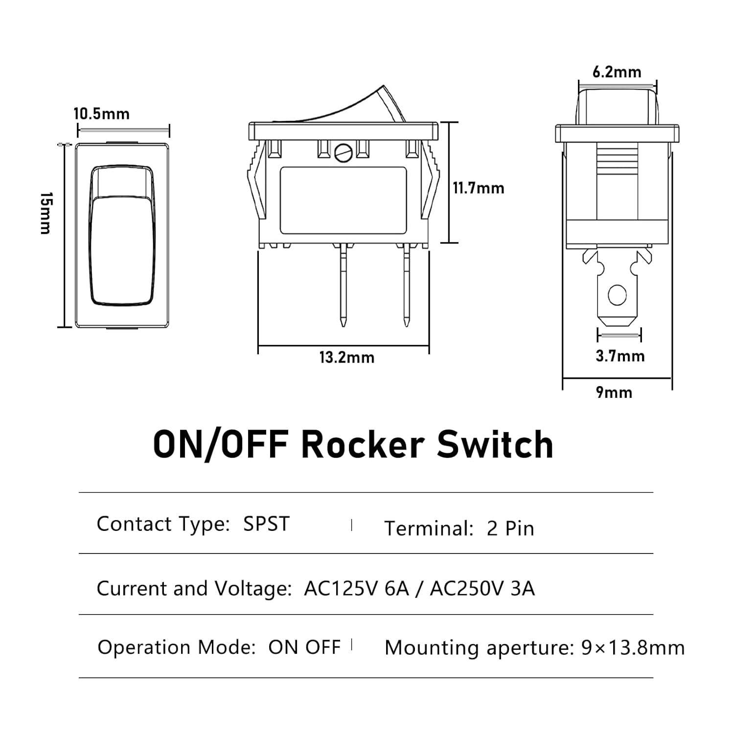 This mini rocker switch is widely used for various kinds of auto, household appliances and DIY power control, such as car, boat, truck, motorcycle panel DIY control, lights, water dispenser, generator, coffee pot, speaker, TV, commutator Vacuum Cleaner and breadboard DIY power control.