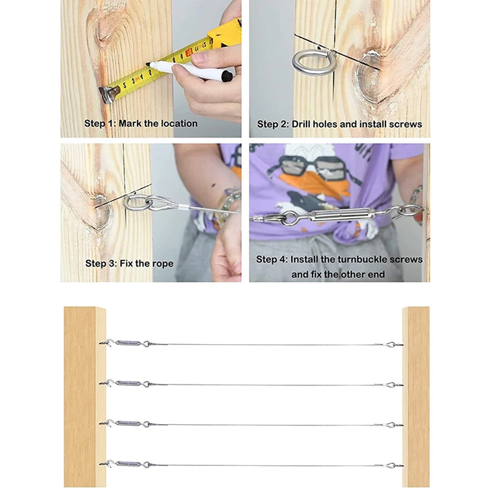 【Easy installation】-- Only crimp aluminum sleeve tool and cable cutter to finish the deck cable railing,The connection between the wood screw and the turnbuckle is adjustable.