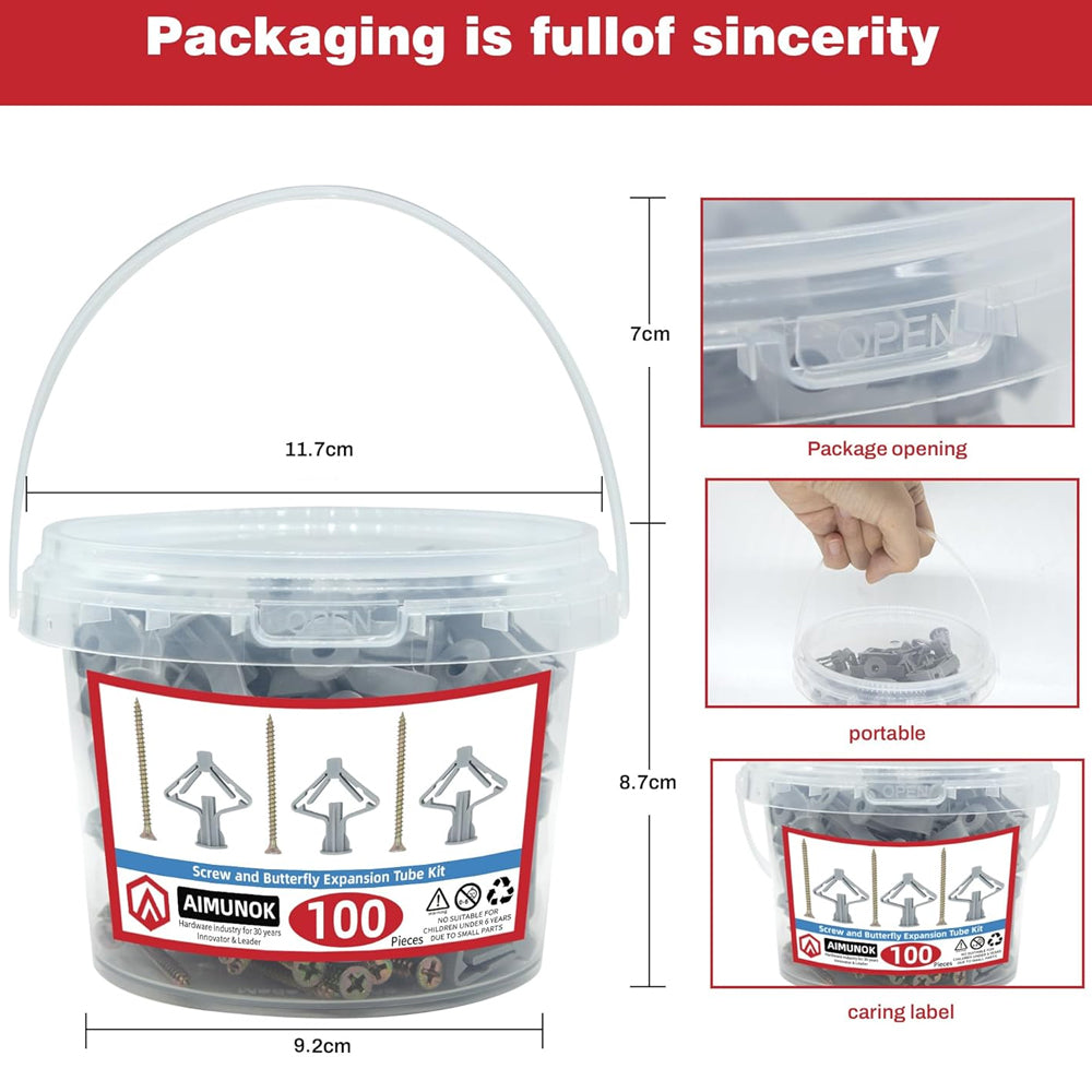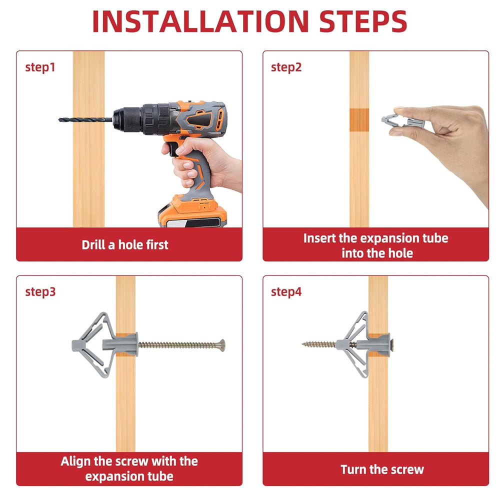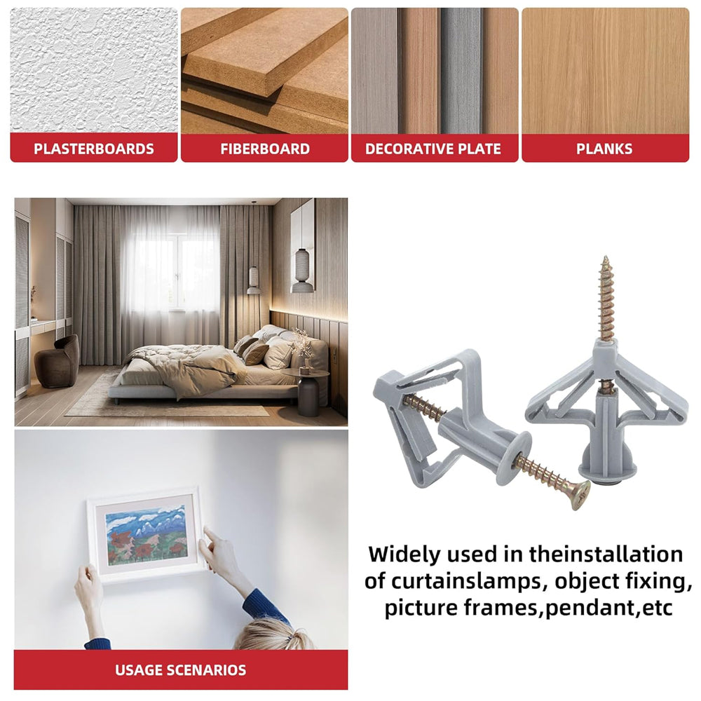 ✅【Plastic wall anchor set】-This anchor screw kit is comprehensive, encompassing 50 butterfly expansion plugs and 50 stainless steel screws, ensuring an ample supply to meet your diverse requirements.