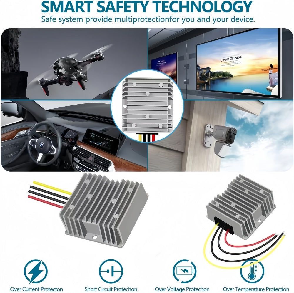 * HIGH QUALITY-- Step down power supply is made of high-quality components and aluminum shell for long service life. Compact aluminium shell with epoxy potting, 100% waterproof, anti-dust, anti-shock protection and better heat dissipation