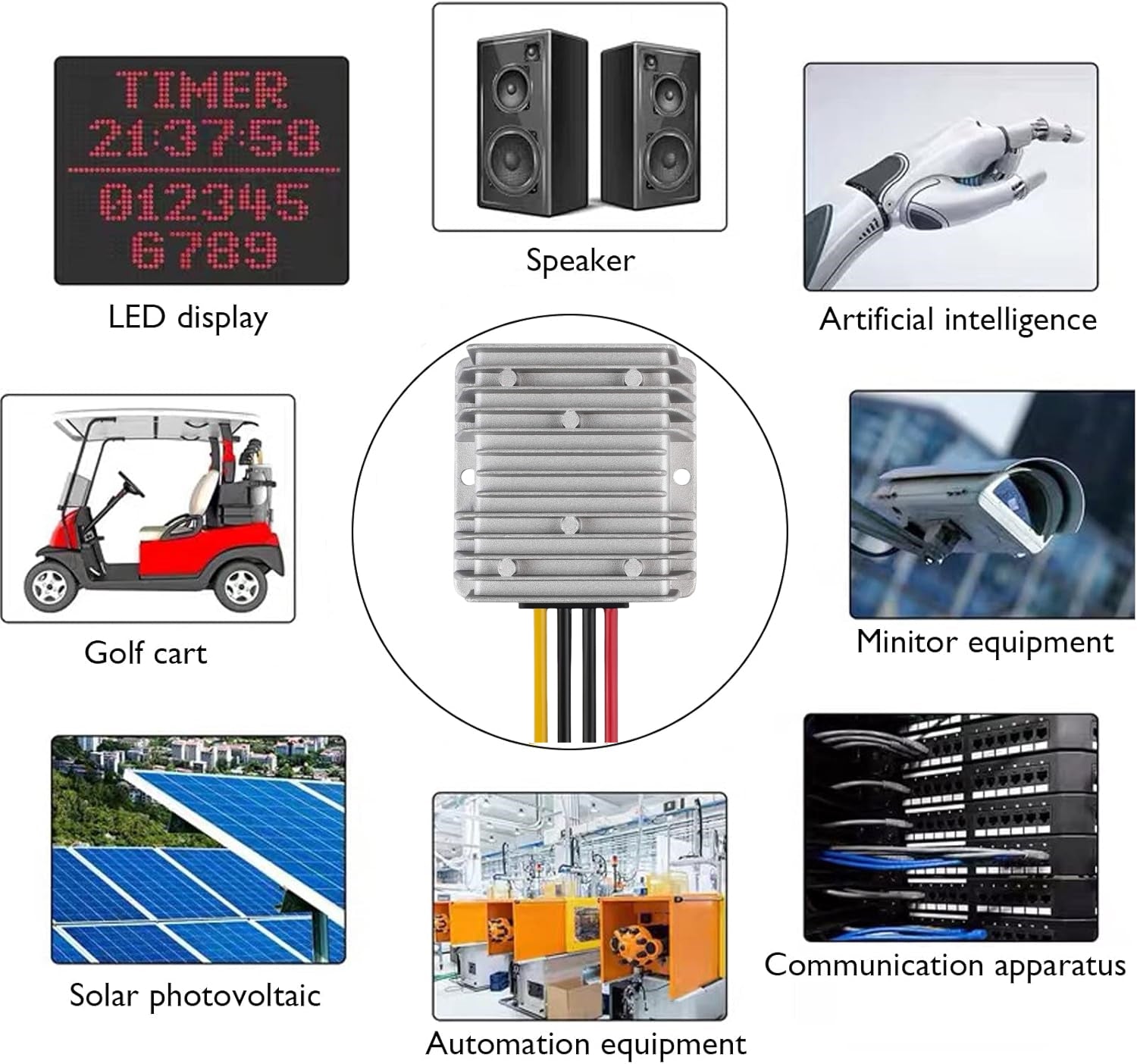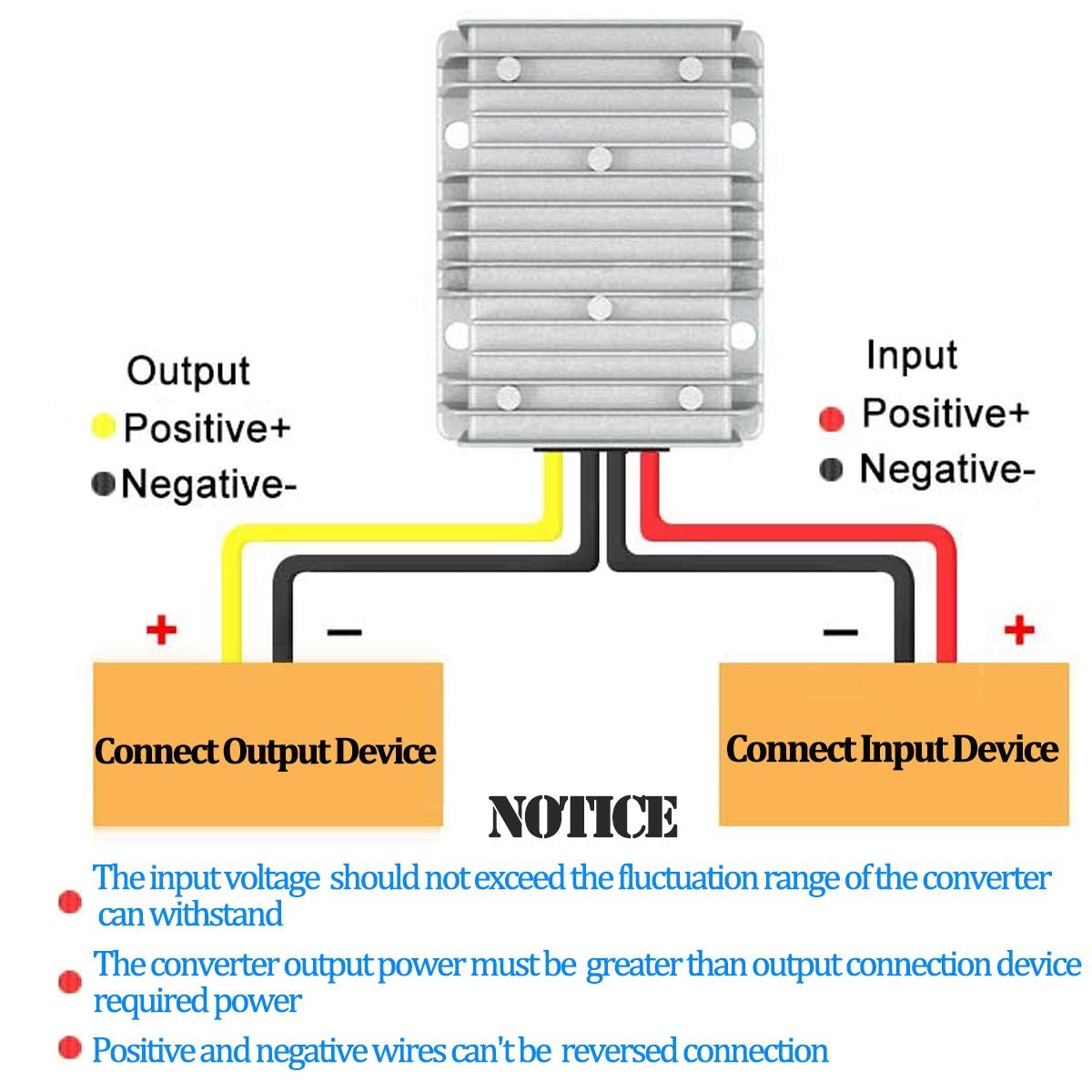 * EASY WIRING-- This power converter has simple construction for easy wiring: Input Red Line +, Black Line -, Output Yellow +, Black -. Can meet the need of low pressure, high current rectifier.