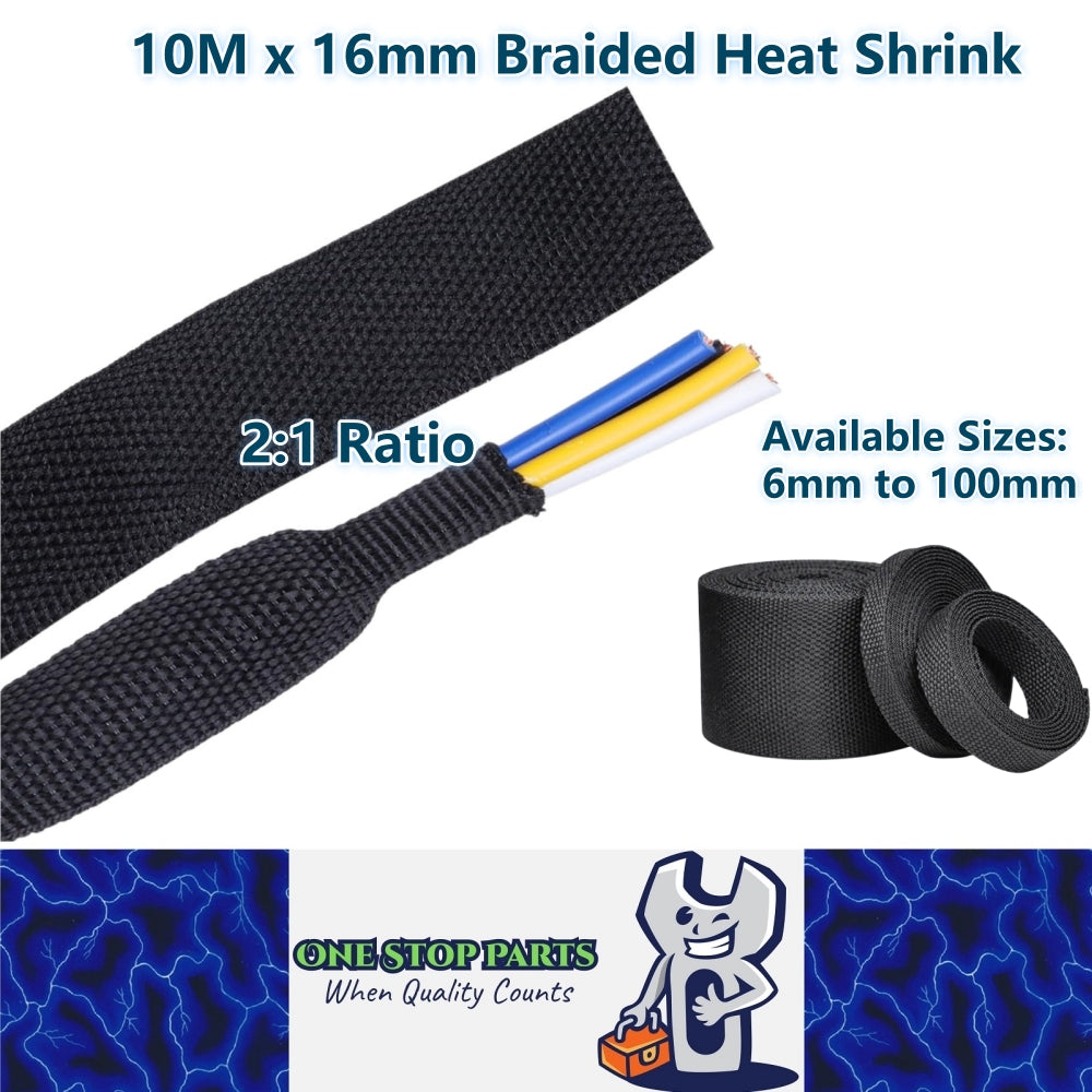 10M x 16mm 2:1 Black Heat Shrink Braided Sleeve Shrink 16mm to 8mm Heat Shrink