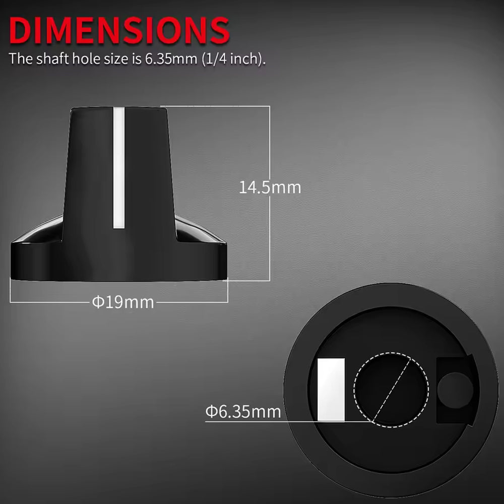 *Size: Control knob total height: 15mm. Base diameter: 19mm. Shaft hole diameter: 6.35mm .