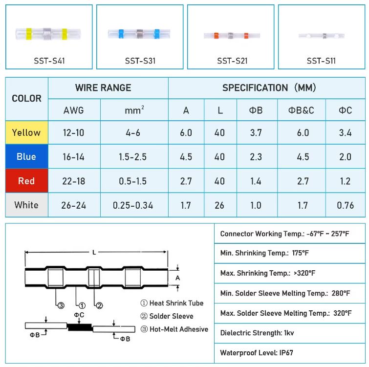 Ideal for any automotive workshop to give a quick easy join with soldering and insulating the join all in one.