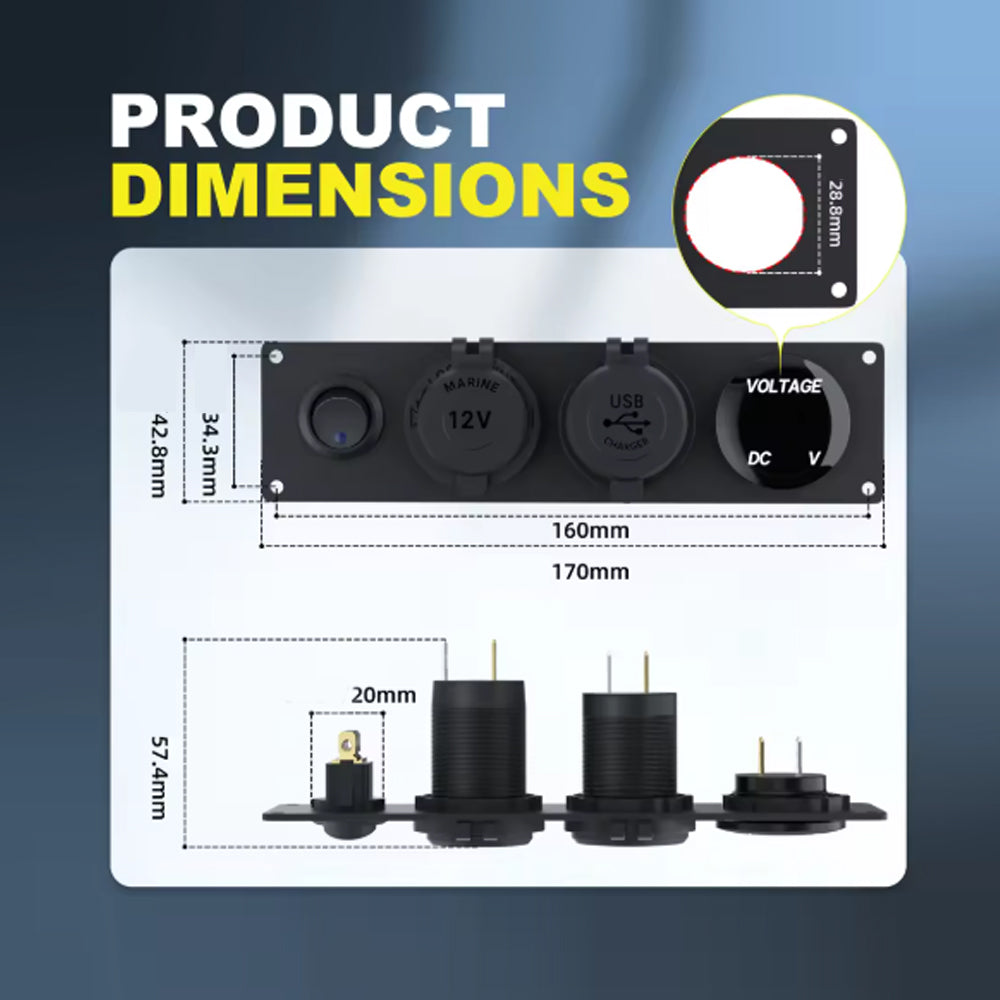4 in 1 DIY Toggle Switch Panel: Dual USB Socket + Voltmeter + 12V Outlet + ON/OFF Toggle Switch.