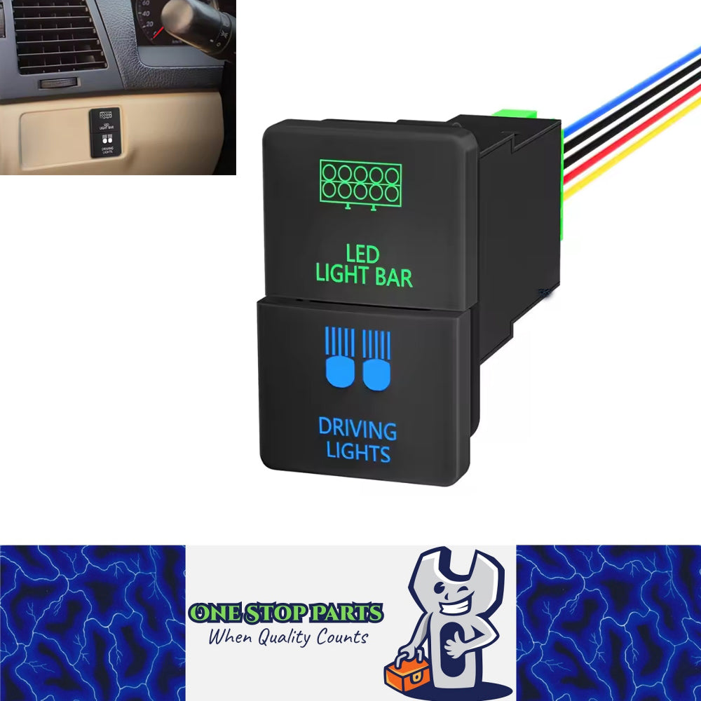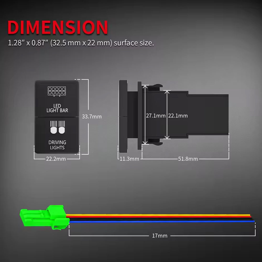 *Type: Backlit dual push button switch with wire kit, 12V Dual ON/OFF button 2 in 1 design, LED light bar and driving light symbol.