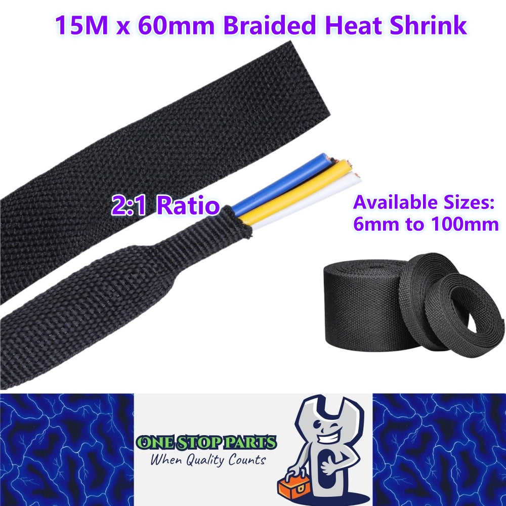 15M x 60mm 2:1 Black Heat Shrink Braided Sleeve Shrink 60mm to 30mm heat shrink