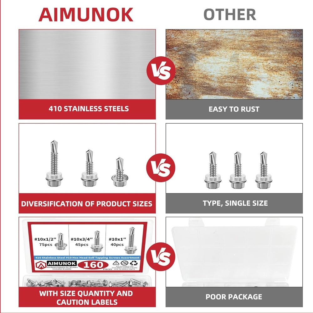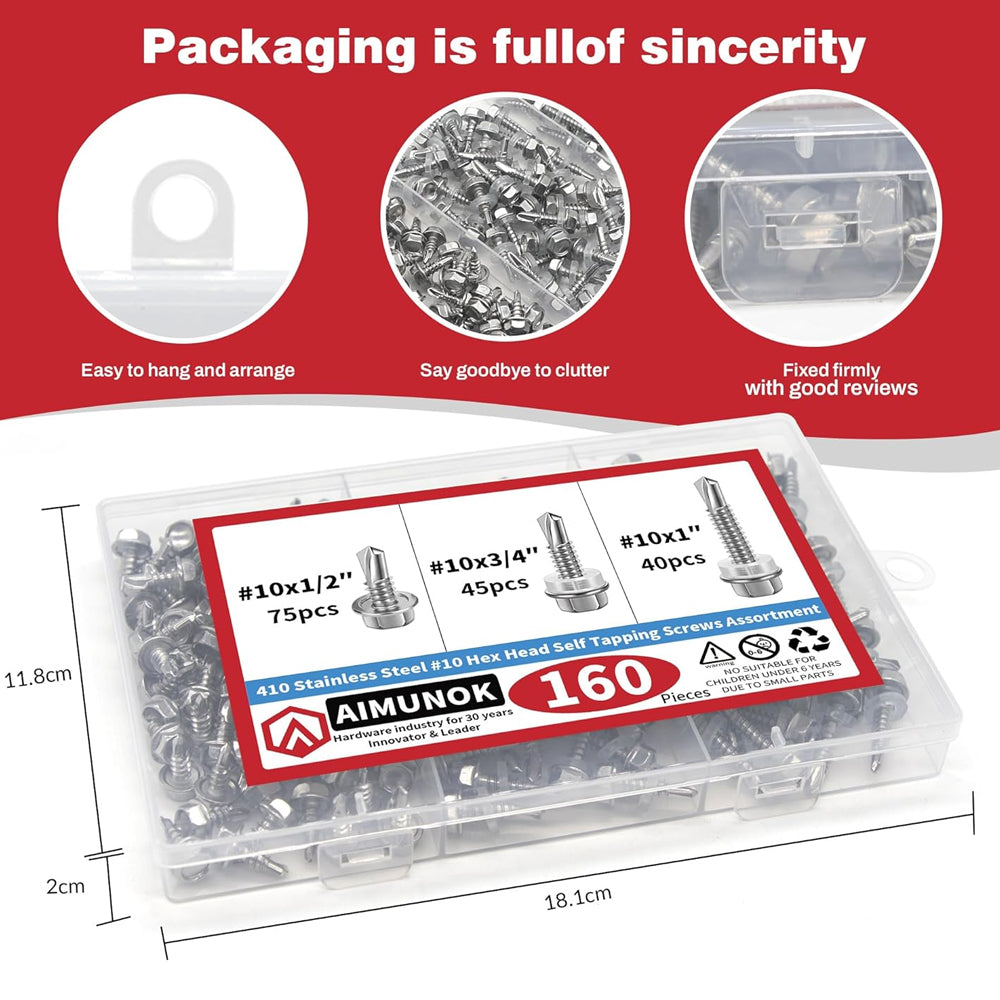 160pcs #10 Hex Head Self Drilling Screws 410 Stainless Steel Metal/Wood Tek