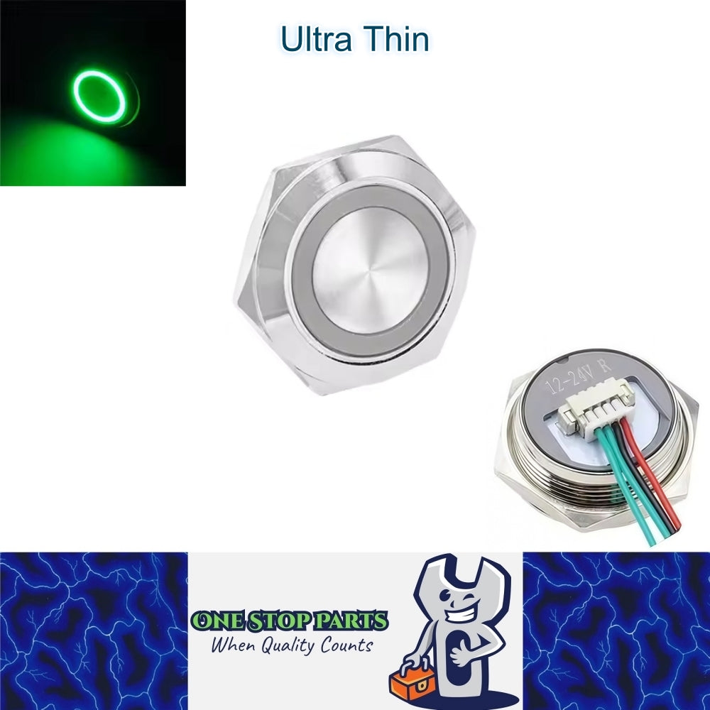 Here we have 16mm Metal Push Button Switch Ultra Thin Green LED 12-24V Pre-Wired Momentary Self-Reset Switch.