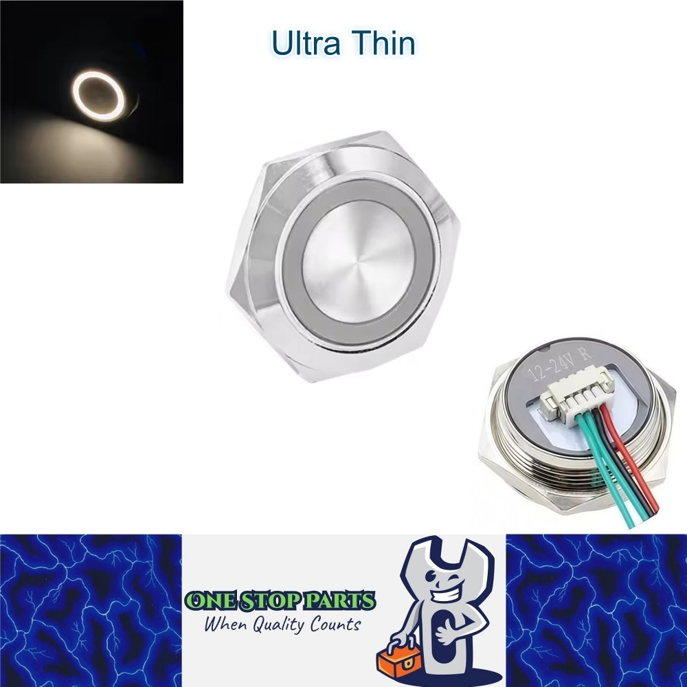 Here we have 16mm Metal Push Button Switch Ultra Thin White LED 12-24V Pre-Wired Momentary Self-Reset Switch.