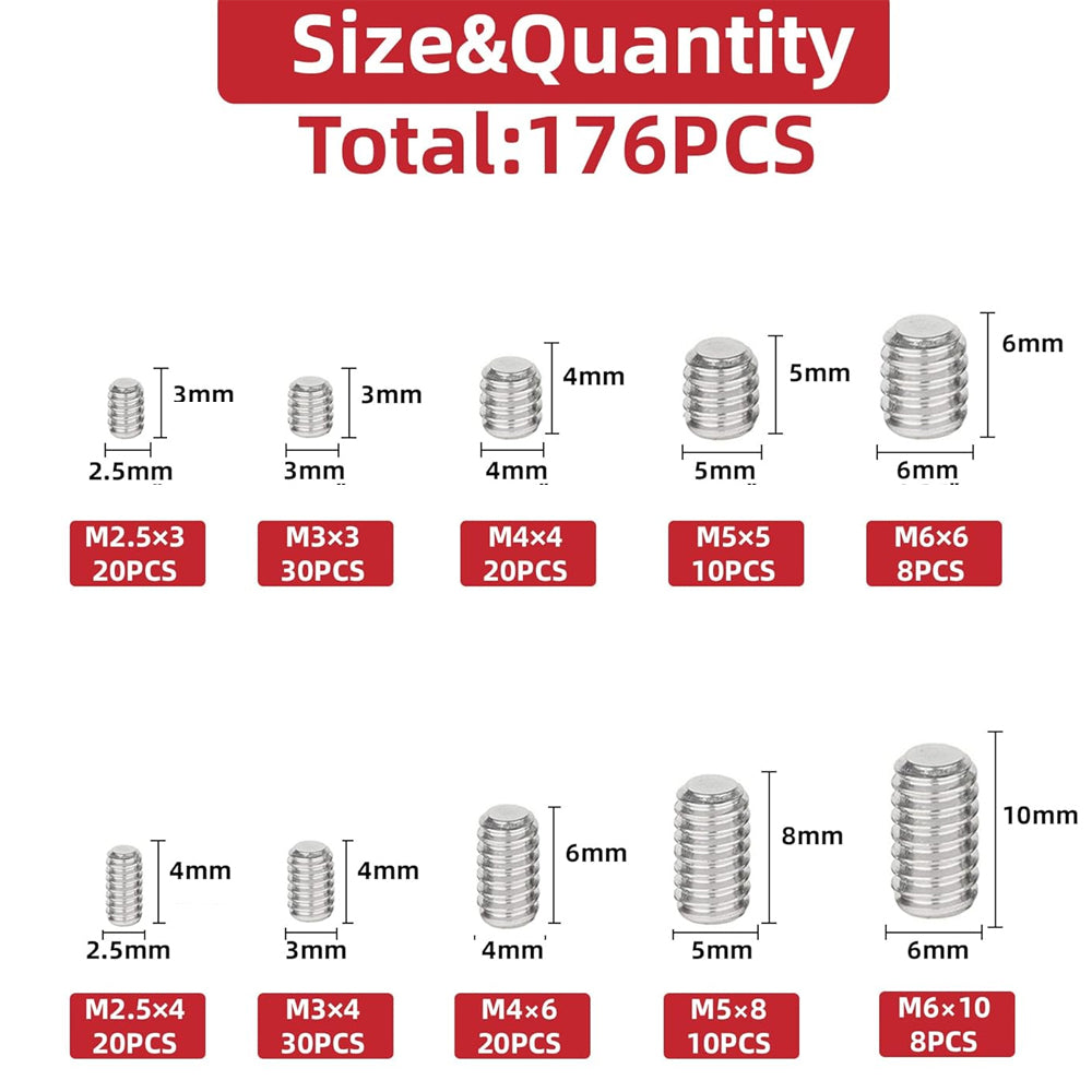 176pcs Allen Head Hex Set Screws M2.5–M8 Assortment Kit 304 SS Grub Bolts