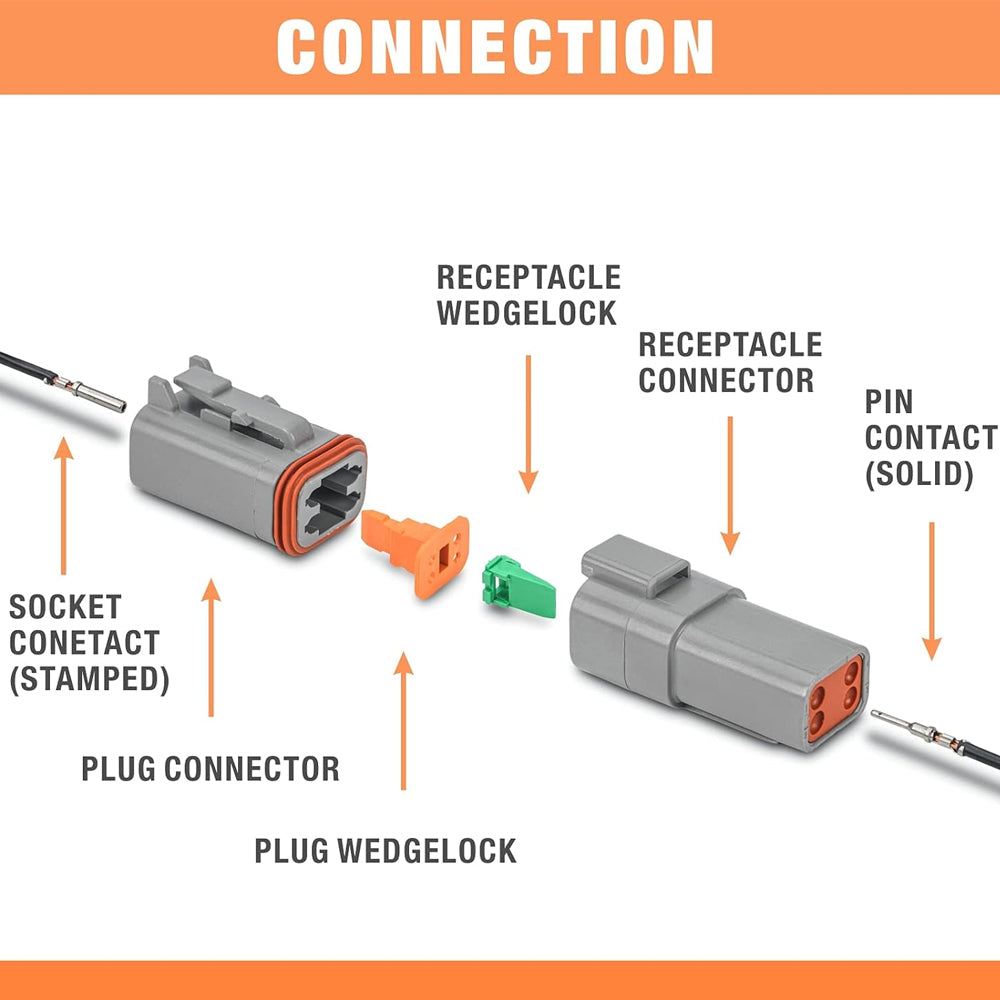 Deutsch DT 2,34,6,8,12 way connector kit(2 Pairs) includes all components of plugs, receptacles, stamped contacts and wedge locks necessary to complete the wire harness. Ideal for OEM pigtails.