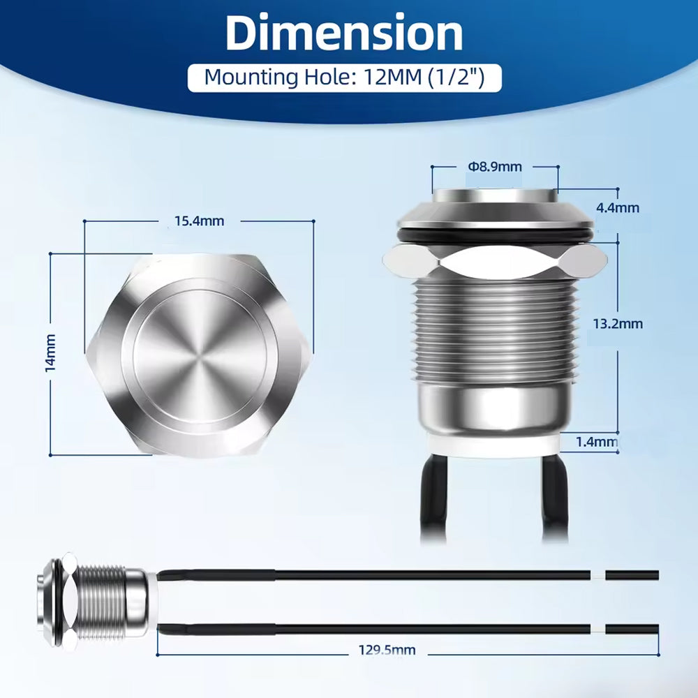 Specification: The mounting hole size is 12mm (1/2"). The rating of this small momentary push button switch is 5A 12V DC; 3A 250V AC.
