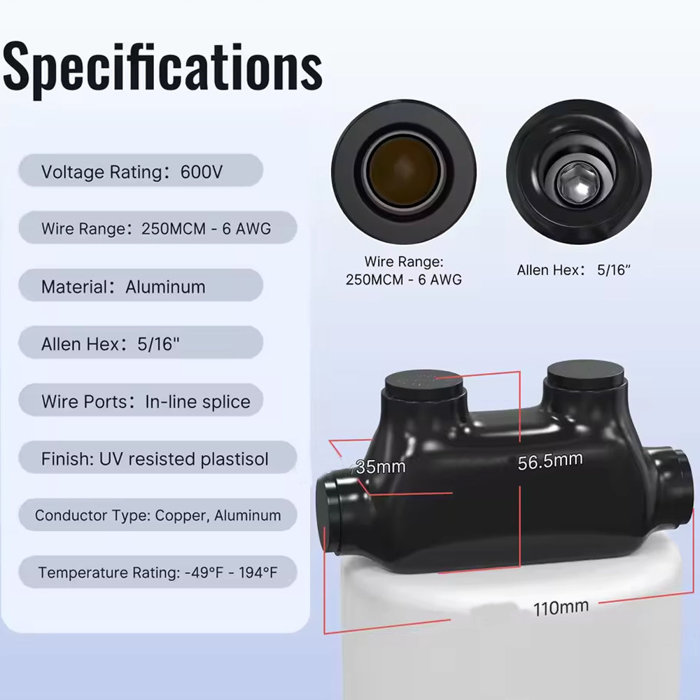 【Unique Design】The in-line splice connectors are specially designed for 250-6AWG wires. It uses hex screw to fix the wires and comes lubricating oil with antioxidant properties in the ports.