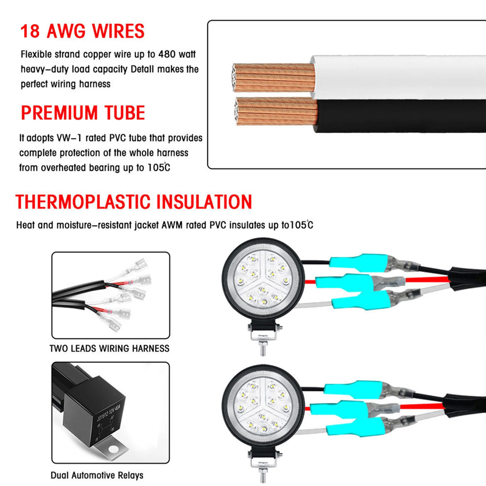 Upgrade 18 AWG Equipped: This led light bar wiring harness is upgraded with 18 AWG sheathed by premium PVC, led wiring harness comes with the relay and fuse.