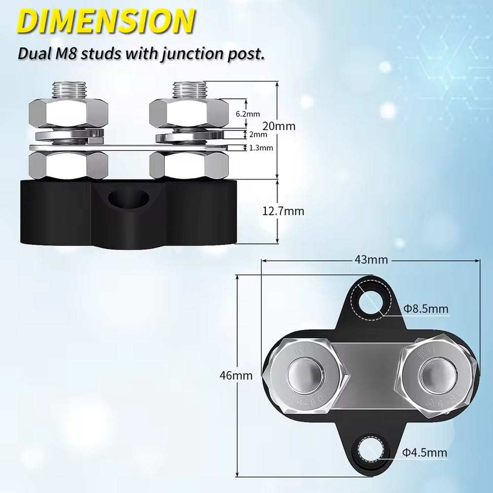 【Dimensions】- Stud size: M8. Maximum working voltage: DC 48V & up to 80Amp. Maximum amplifier per circuit: determined by the connected wires.