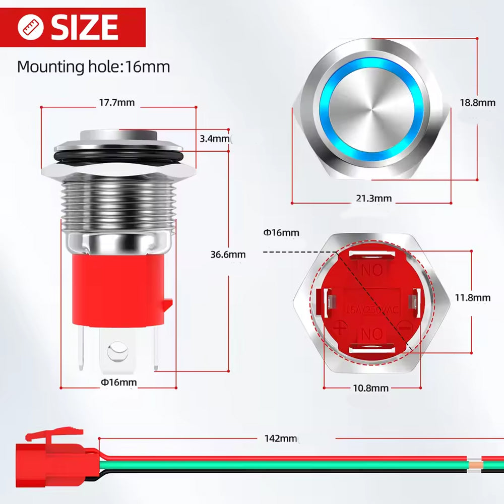 Latching Push Button Switch: Package includes 2pcs 12v push button switches 16mm with wire socket, 4 pin (2 switch pins and 2 LED pins).