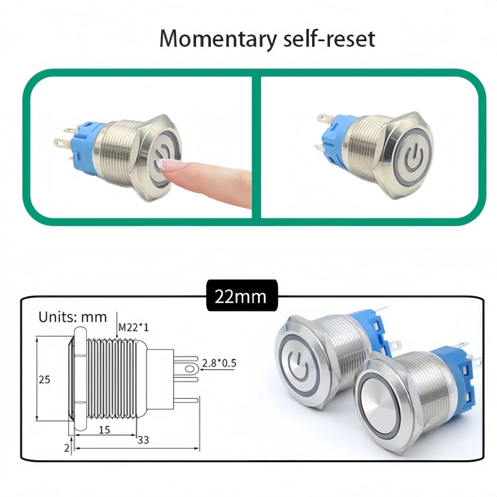 Constructed from robust metal, this switch is built to withstand the demands of both residential and commercial settings. Its durable construction ensures longevity and reliability, making it an ideal choice for environments where performance is paramount. The switch's momentary/latching functionality allows for versatility in operation, catering to different user preferences. Whether you need a switch that automatically resets or one that locks in position, this push button switch offers both options to suit your specific requirements.