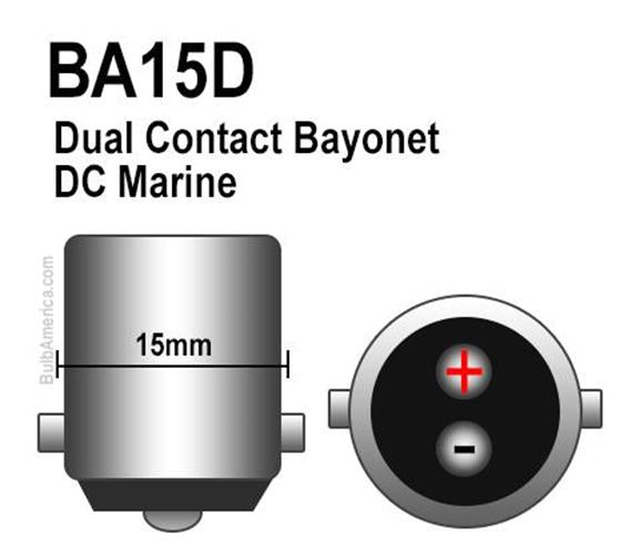Here we offer our BA15D style led globe replacement which offers 2 contacts on the base, 1 contact being pos and 1 neg with the side locating pins straight opposite and same heights, common in caravan lighting and marine applications.