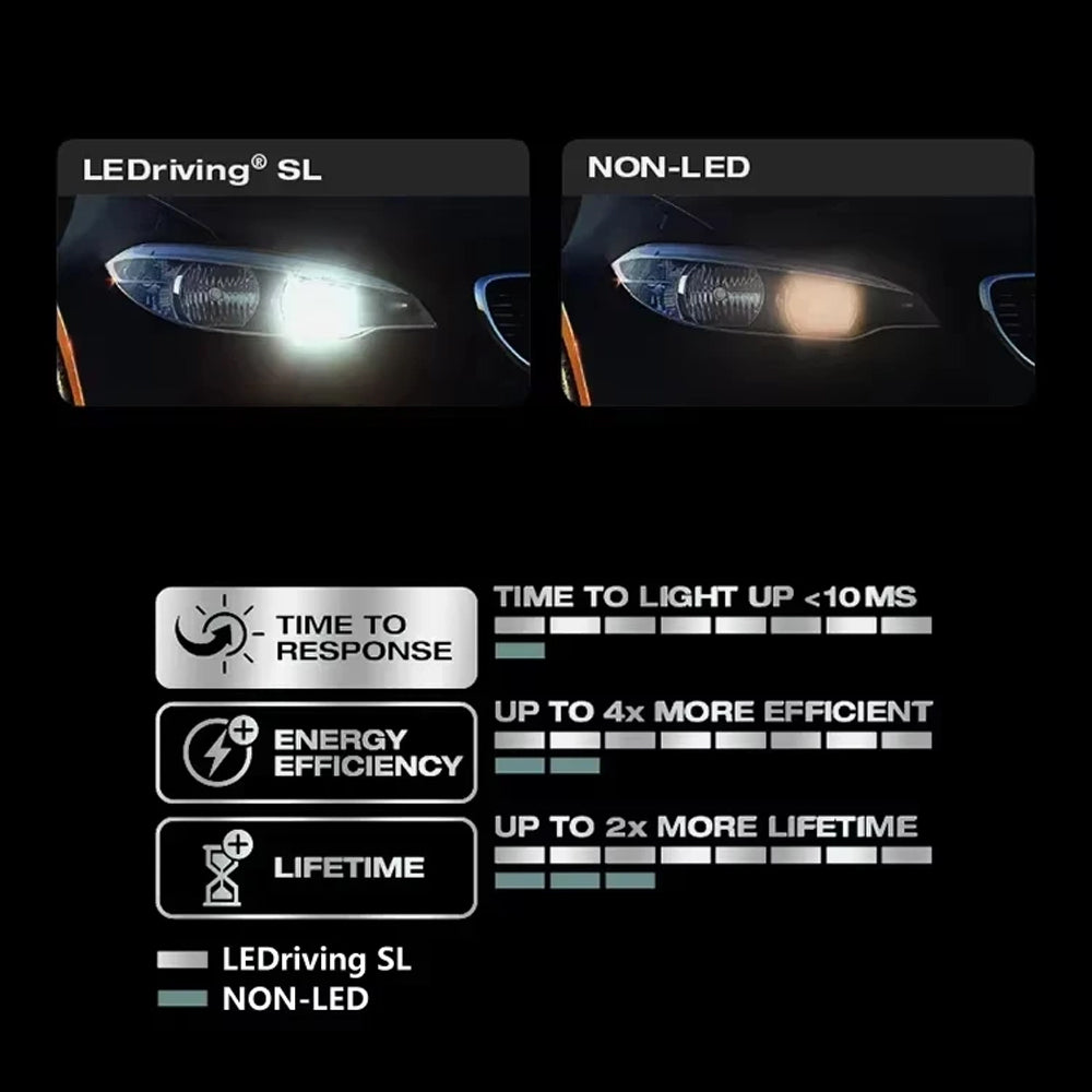 LEDriving SL C5W replacement lamps offer a modern and intense light with a color temperature up to 6000K. These replacement lamps are suitable for all conventional C5W lamp bases. In comparison to standard lamps, these LED retrofit lamps use up to 80% less energy.