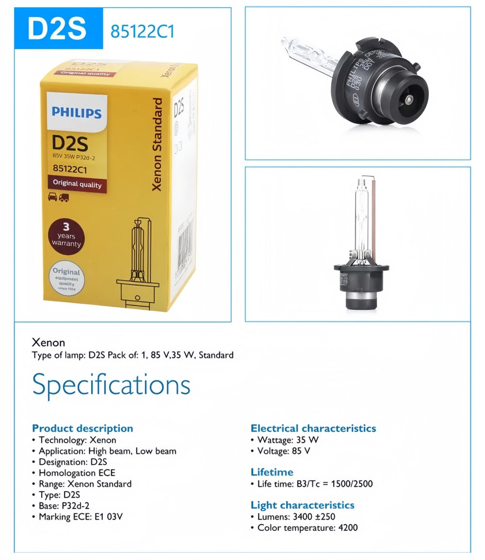 -Philips standard xenon lamps provide the original quality performance of new cars. The quality of the bulb is recognized by all major car manufacturers.