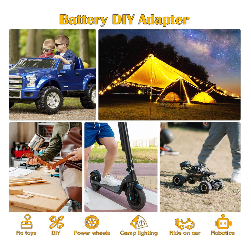 ✅Widely used, power wheels battery adapter has 12 gauge wire installed, Maximum permissible current 20A, provides enough power upgrade your power tools, ride on toys, work lights or robotics DIY.