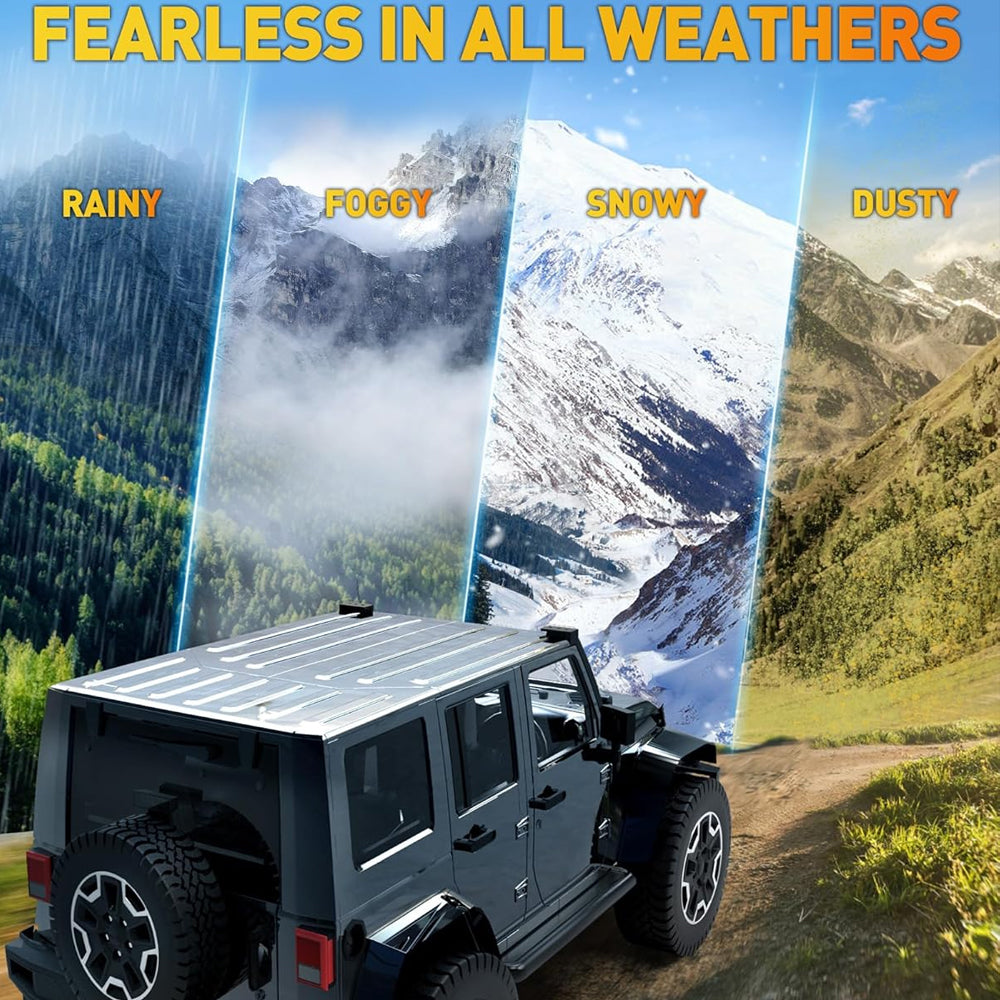 [Excellent Performance] - The led light bars adopt die-cast aluminum housing and advanced sealing technology, waterproof level reaches IP68, and with a sturdy PC lens, which effectively resists rain, snow, sandstorms and other harsh conditions. Moreover, the back of light is designed with 10 cooling fans to dissipate heat efficiently. The combination of these superior functions results in light lifespan of up to 50000 hrs, ensuring reliable driving in demanding environments.