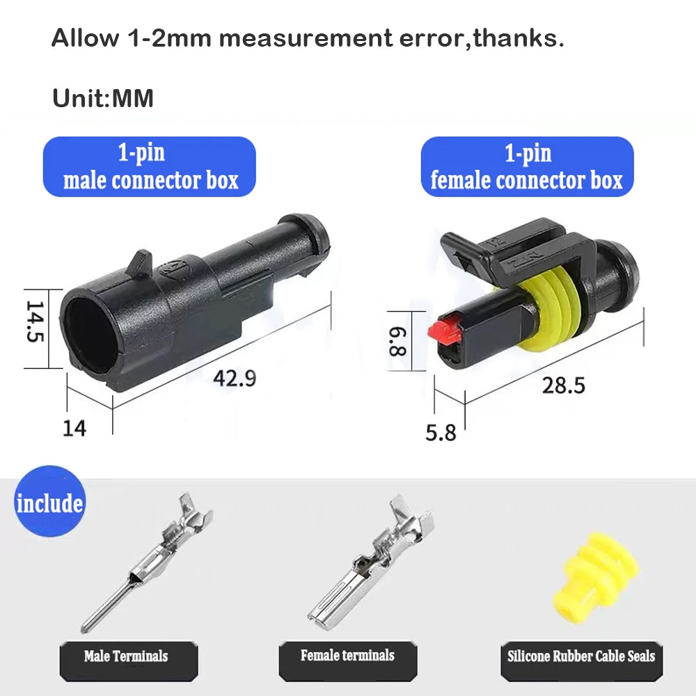 *Connector Terminals: The good-quality rubber seal makes it better dustproof and waterproof, waterproof level: IP67. The female & male terminal is composed of pure copper and phosphor copper, which has high conductivity.