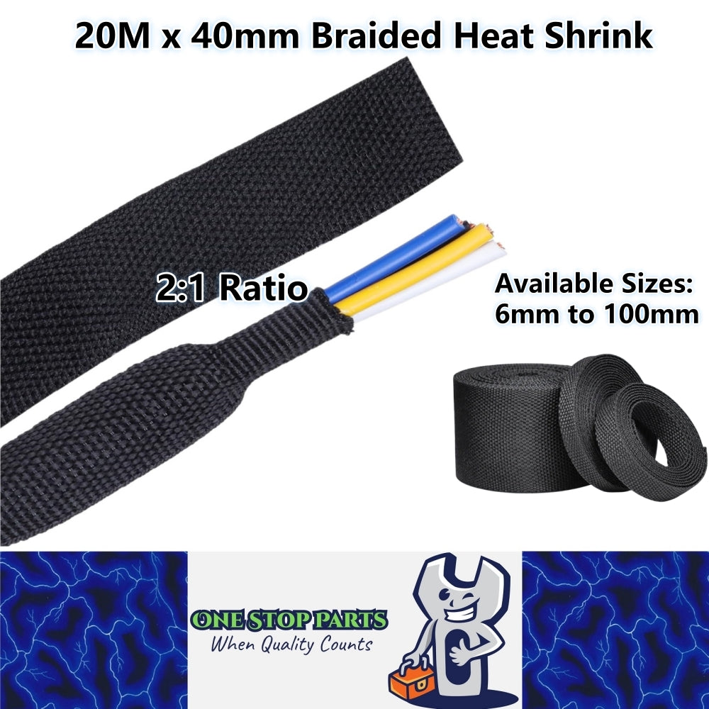 20M x 40mm 2:1 Black Heat Shrink Braided Sleeve Shrink 40mm to 20mm heat shrink