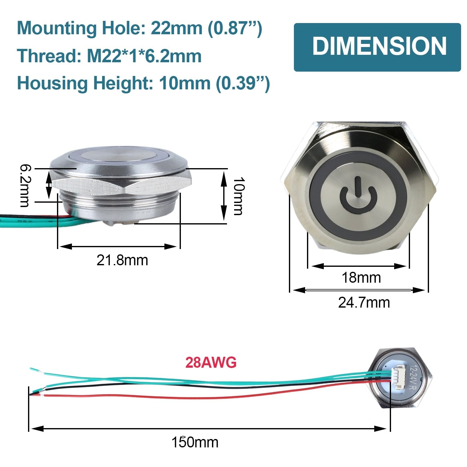 22mm Blue LED Metal Push Button Switch Ultra Thin 12-24V Pre-Wired Self Reset