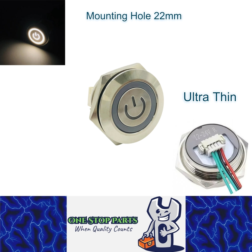 Here we have 22mm Metal Push Button Switch Ultra Thin White LED 12-24V Pre-Wired Momentary Self-Reset Switch.