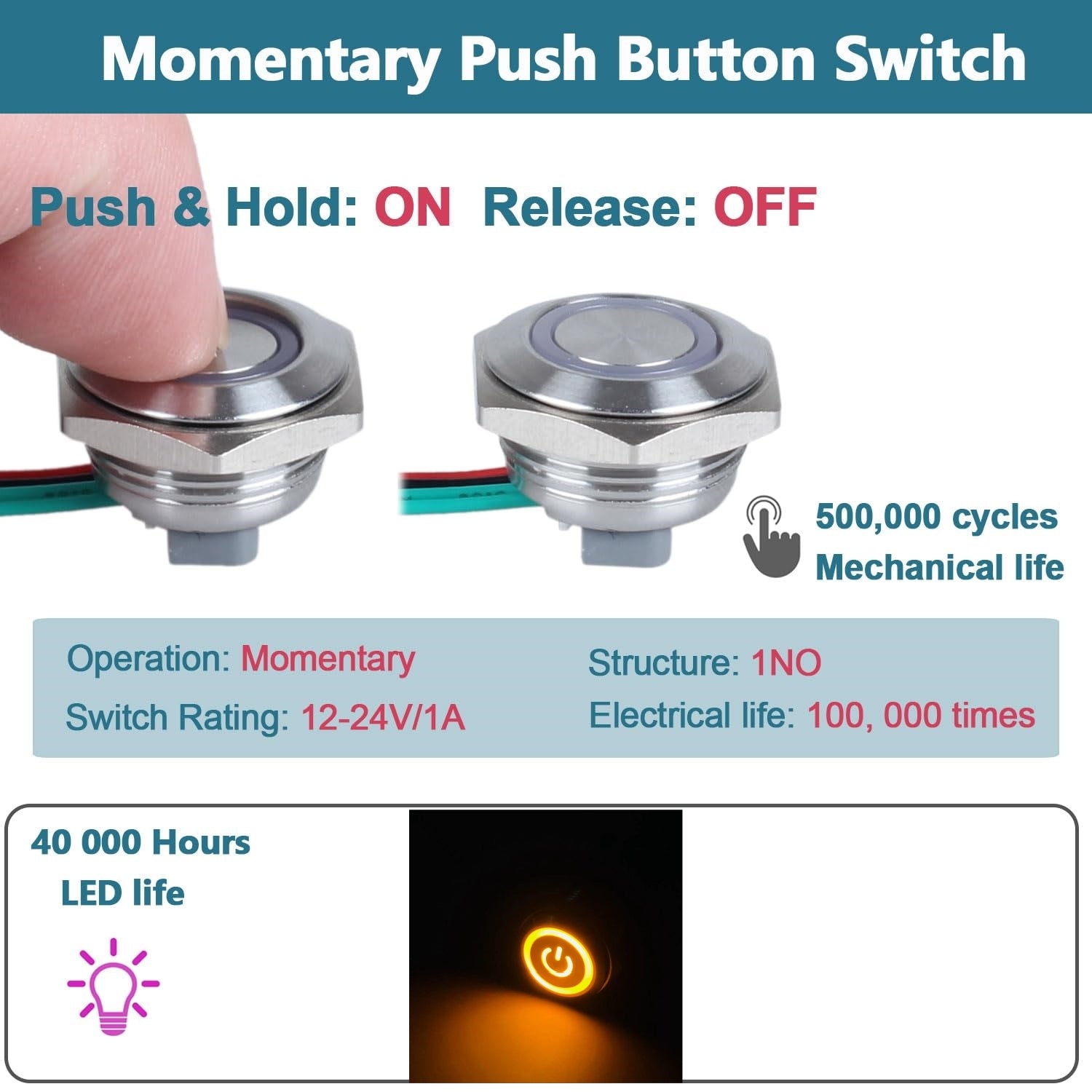 Here we have 22mm Metal Push Button Switch Ultra Thin Yellow LED 12-24V Pre-Wired Momentary Self-Reset Switch.