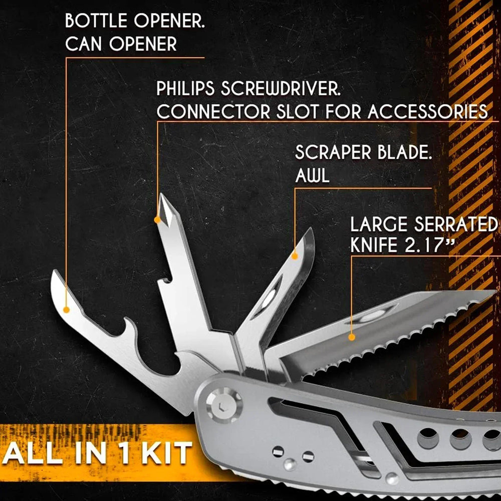 spring loaded pliers, wire cutter and stripper, folding serrated and main blade knife, can and bottle opener, metal file, screwdrivers, 11 attachable bits with magnetic connector, scraper and awl. It is a true multifunction utility tool.
