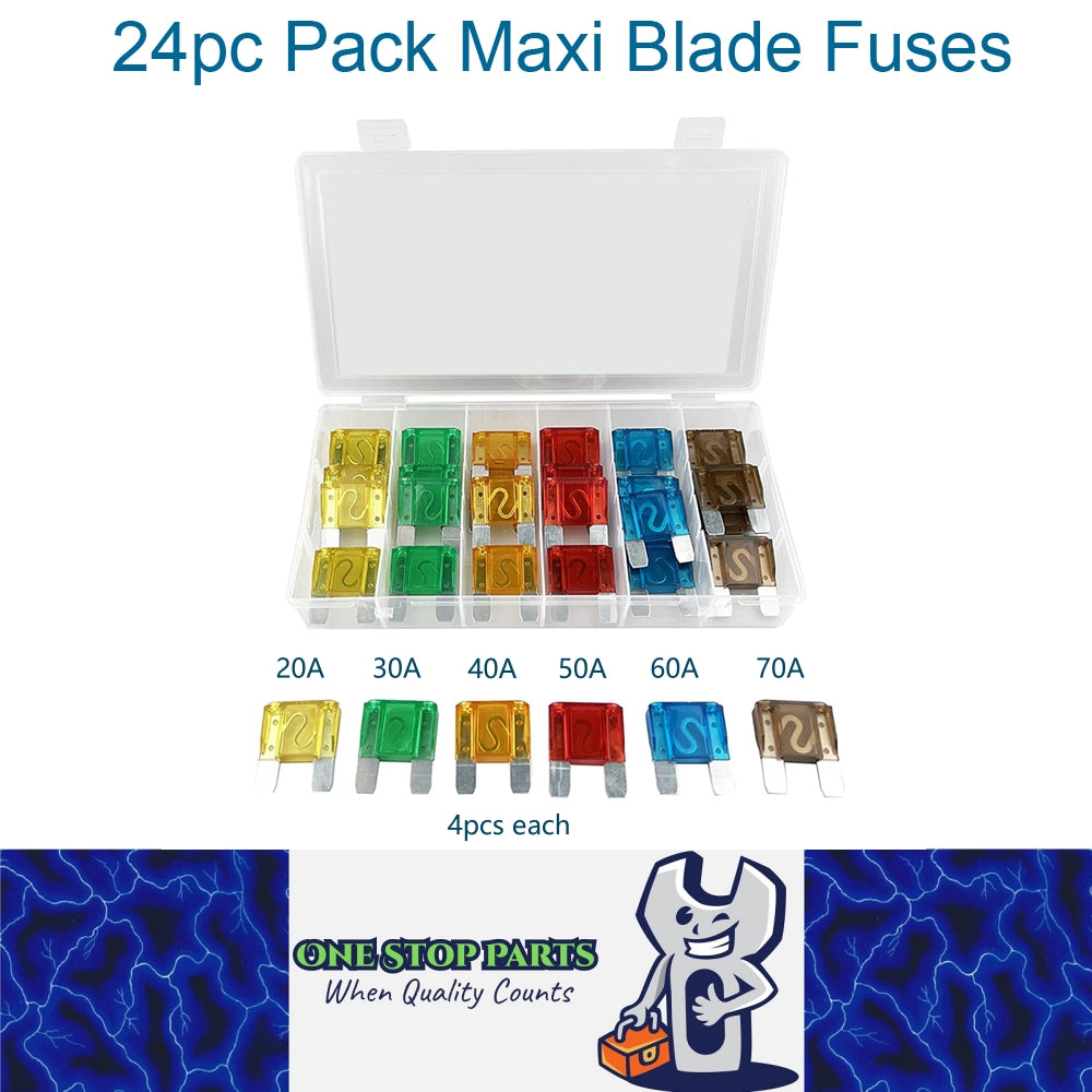 Here we have on offer is 24pc Pack Maxi Blade Fuses Mixed Pack 6 Sizes 20A 30A 40A 50A 60A 70A (24pcs)