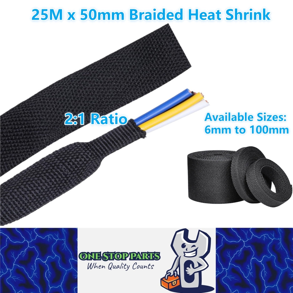 25M x 50mm 2:1 Black Heat Shrink Braided Sleeve Shrink 50mm to 25mm heat shrink
