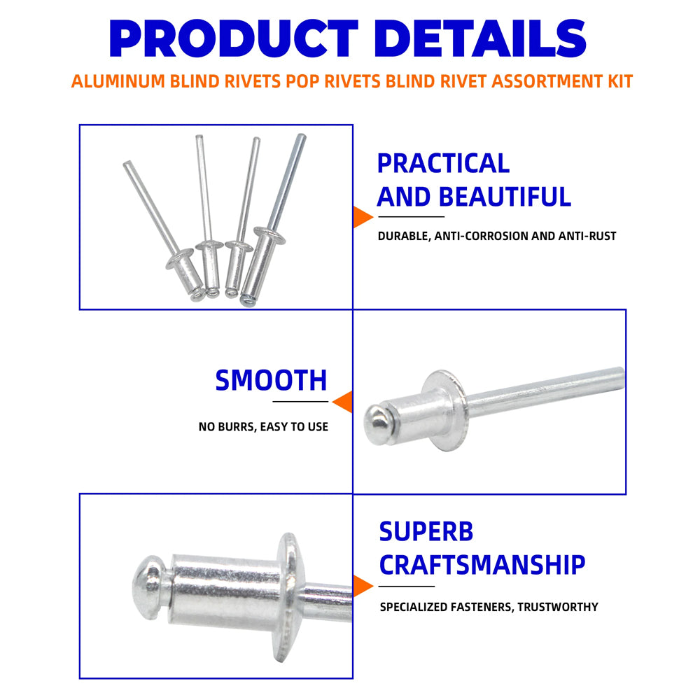 HIGH QUALITY - These rivets are made of Aluminum Grip and Steel Mandrel. With high performance of corrosion resistance and acid resistance, they are strong and durable, when installed, you will no longer worry about them rusting and breaking.