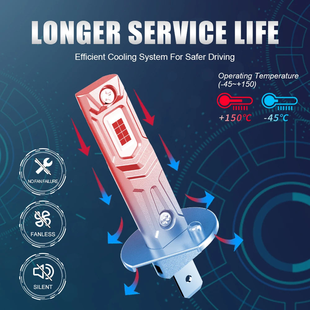 1. Turbo design , speed up heat dissipation ,provide a longer lifespan . 2. No fan , No Nosie, No Radio Interference 3. Mini Size Design . 1:1 Size Design with Halogen Bulb, Plug and Play,Fit for 99% Vehicles. 4. No Polarity, Easy to Install.